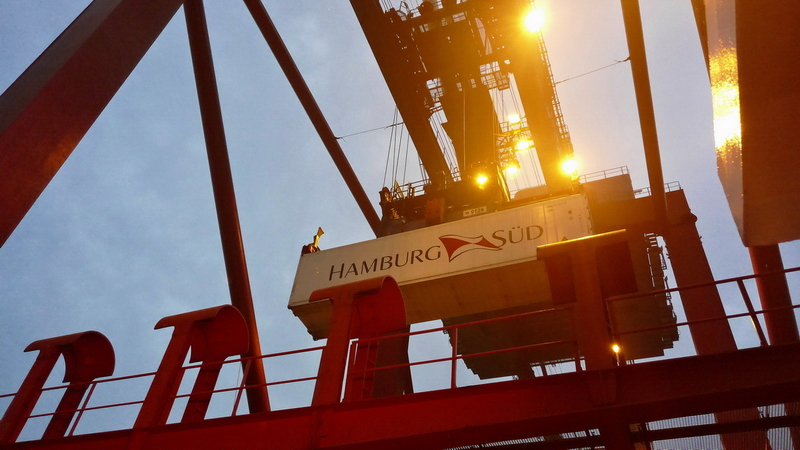 Container werden verladen, Portalhubwagen wuseln wie ferngesteuert über das Terminal, starke Strahler beleuchten nachts das Gelände.